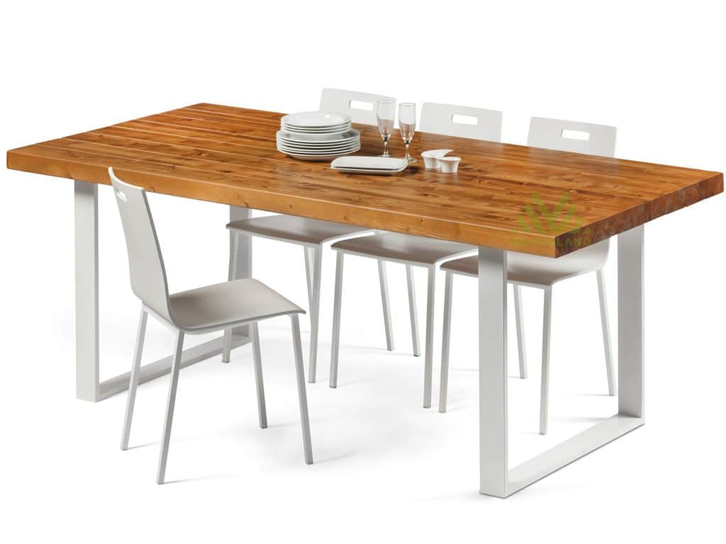 Esta mesa de comedor está fabricada con madera de abeto nórdico y acero de alta calidad. El panel de madera maciza laminada de 6cm de grosor está diseñado con un sistema de encolado especial que minimiza la torsión y dilatación, asegurando que su forma y estabilidad se mantengan inalterables con el paso del tiempo.