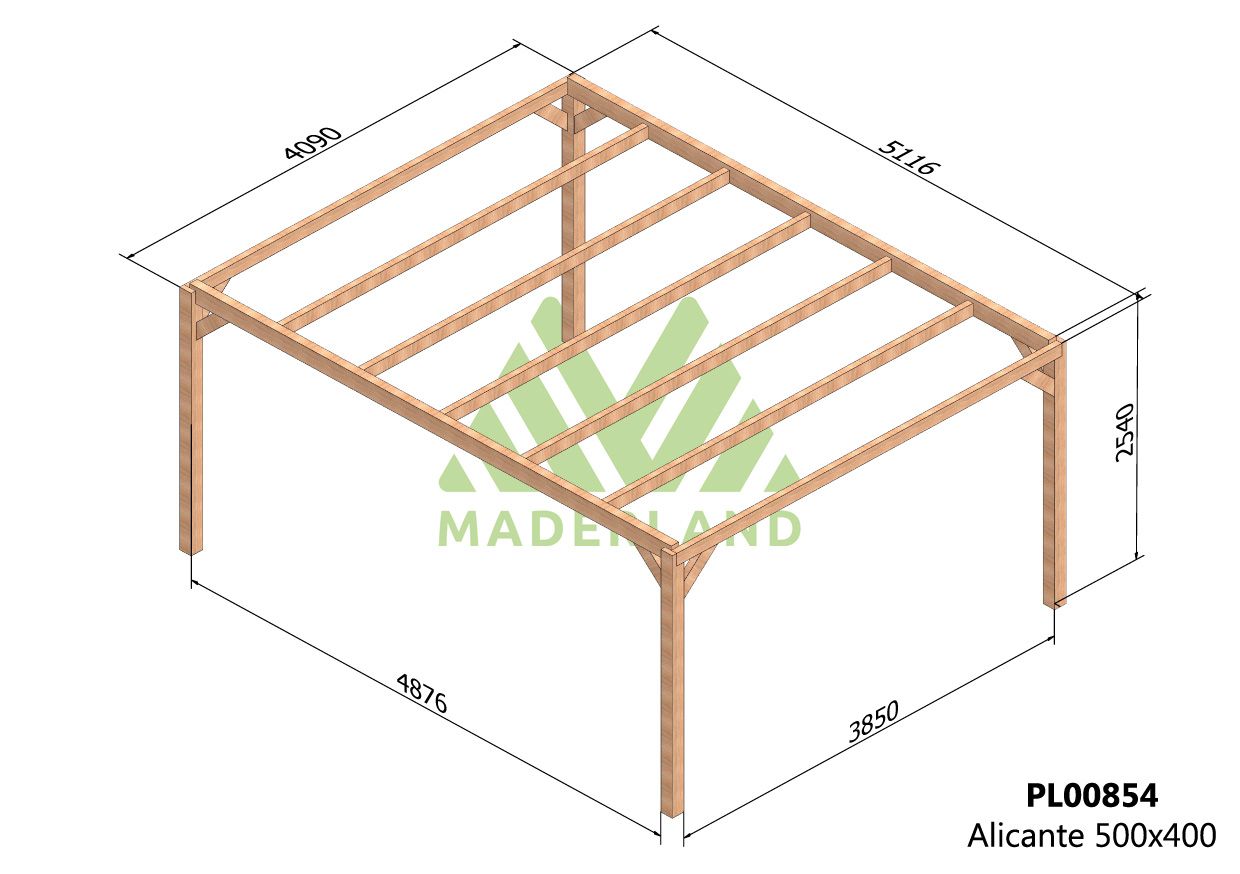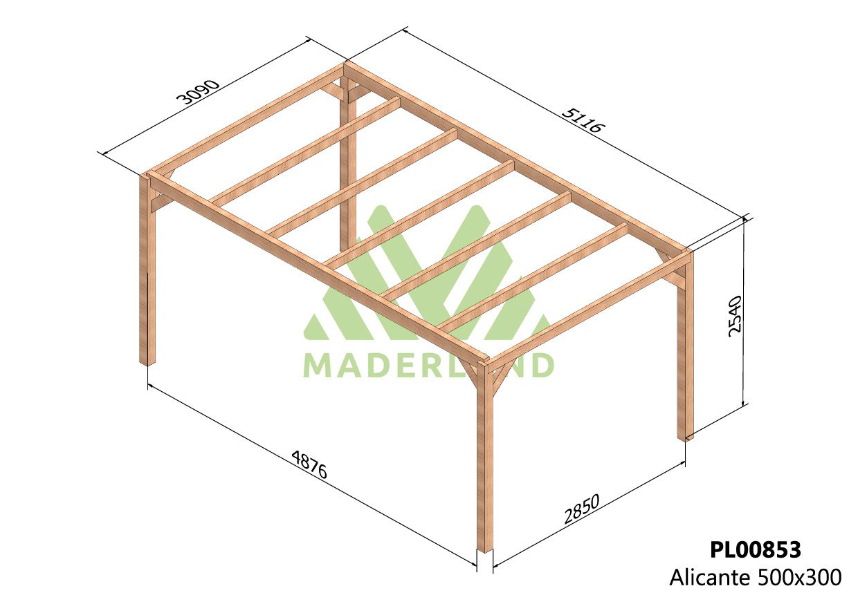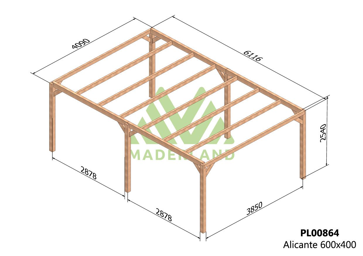 La madera laminada utilizada en esta pérgola destaca por ser un material más resistente y con mejor comportamiento que la madera maciza, debido a su proceso de fabricación y procesado, marcado por unas exigentes normativas establecidas por la UE. Las diferencias entre ambos materiales es que la madera laminada tiene una menor tendencia a contraerse y expandirse, lo que previene la torsión y sobretodo la deformación (alabeo) de los elementos estructurales como postes, vigas y travesaños que podrían afectar a la estética de una pérgola de madera. Por todo ello, la madera laminada es un material comúnmente empleado en la construcción de casas de madera para primera vivienda.