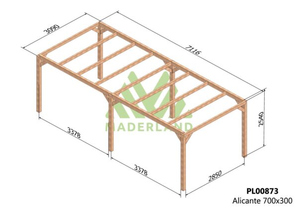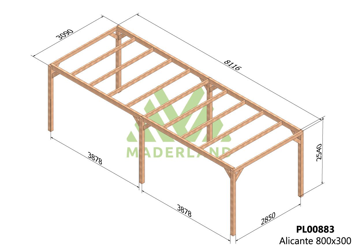 Esta estructura de madera autoportante está fabricada con madera laminada proveniente del norte de Europa donde el lento crecimiento garantiza unas mejores propiedades mecánicas ante cualquier posible adversidad, mejorando la resistencia a la flexión estática, a la compresión y a la tracción.