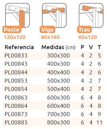 Esta pérgola de madera autoportante está disponible en varias dimensiones para adaptarse a las características de su jardín. La cantidad de postes (P), vigas (V) y travesaños (T) varían en función del tamaño seleccionado. Puede ver la cantidad exacta de cada tamaño en las imágenes 3D que encontrará debajo de la foto principal de la pérgola y/o en la imagen a la derecha de este texto.