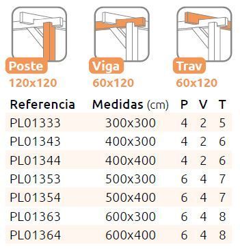 Esta pérgola de madera autoportante está disponible en varias dimensiones para adaptarse a las características de su jardín. La cantidad de postes (P), vigas (V) y travesaños (T) varían en función del tamaño seleccionado. Puede ver la cantidad exacta de cada tamaño en las imágenes 3D que encontrará debajo de la foto principal de la pérgola y/o en la imagen a la derecha de este texto.