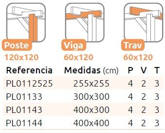 Importante: La cantidad de postes (P), vigas (V) y travesaños (T) varían en función del tamaño seleccionado. Puede ver la cantidad exacta de cada tamaño en las imágenes 3D que encontrará debajo de la foto principal de la pérgola.