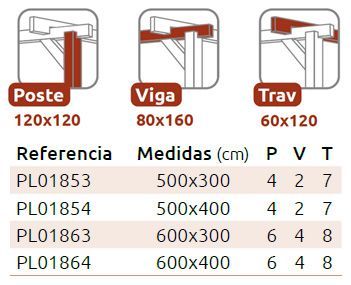 Importante: La cantidad de postes (P), vigas (V) y travesaños (T) varían en función del tamaño seleccionado. Puede ver la cantidad exacta de cada tamaño en las imágenes 3D que encontrará debajo de la foto principal de la pérgola.