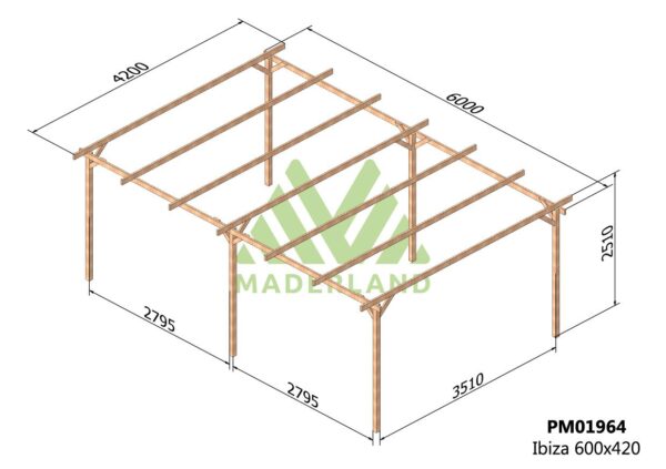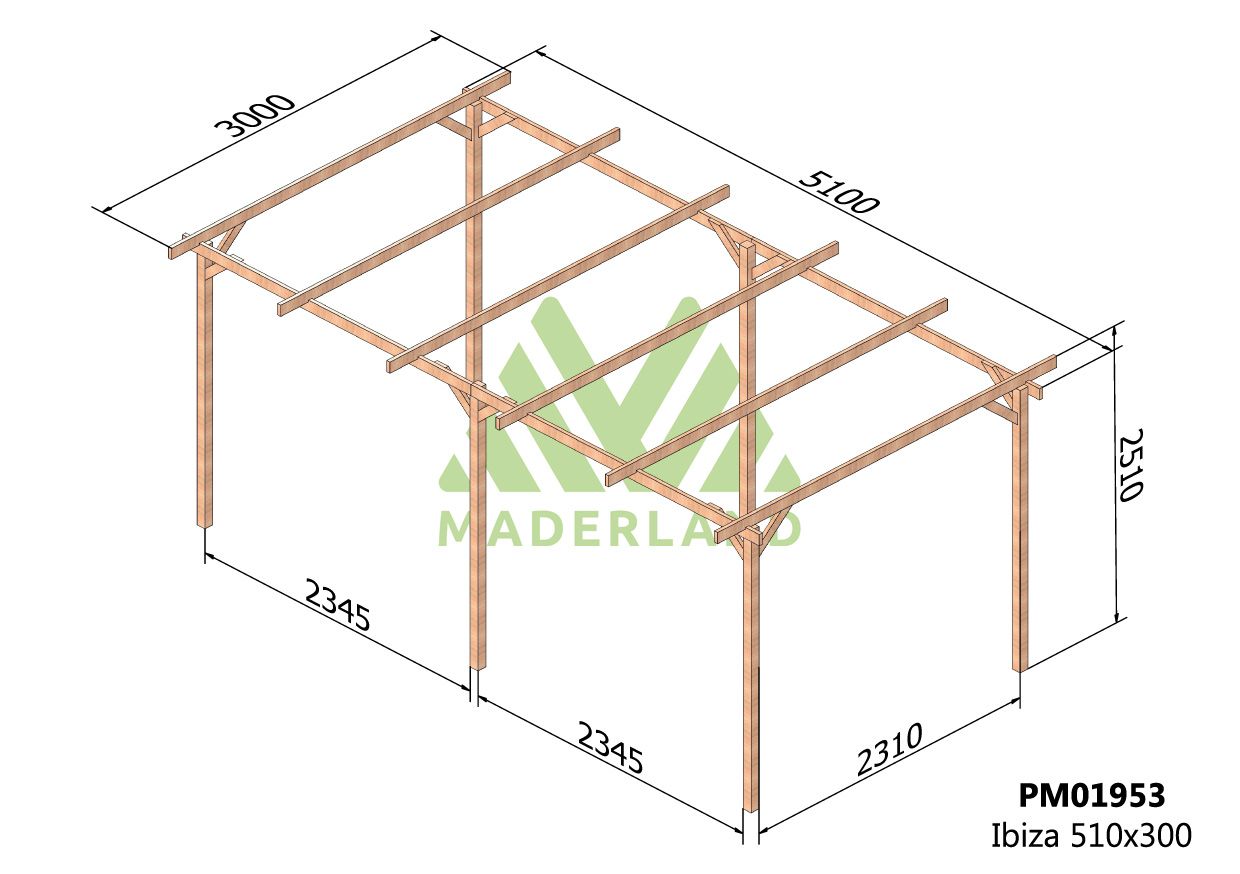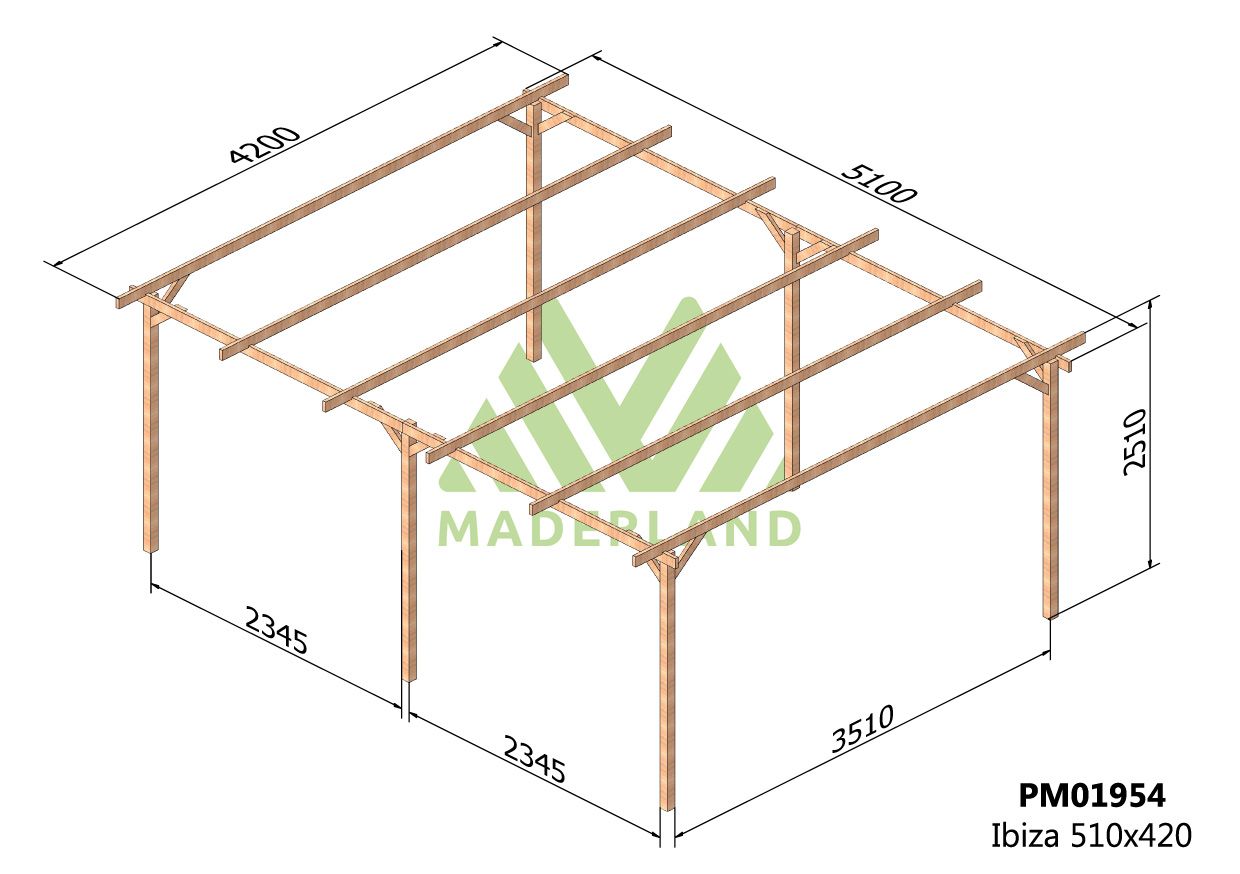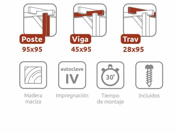 Detalles de Postes, Vigas y TravesañosEste porche para coche autoportante está fabricado con madera maciza tratada proveniente del norte de Europa donde el lento crecimiento garantiza unas mejores propiedades mecánicas ante cualquier posible adversidad, mejorando la resistencia a la flexión estática, a la compresión y a la tracción.