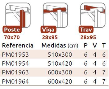 Importante: La cantidad de postes (P), vigas (V) y travesaños (T) varían en función del tamaño seleccionado. Puede ver la cantidad exacta de cada tamaño en las imágenes 3D que encontrará debajo de la foto principal de la pérgola.